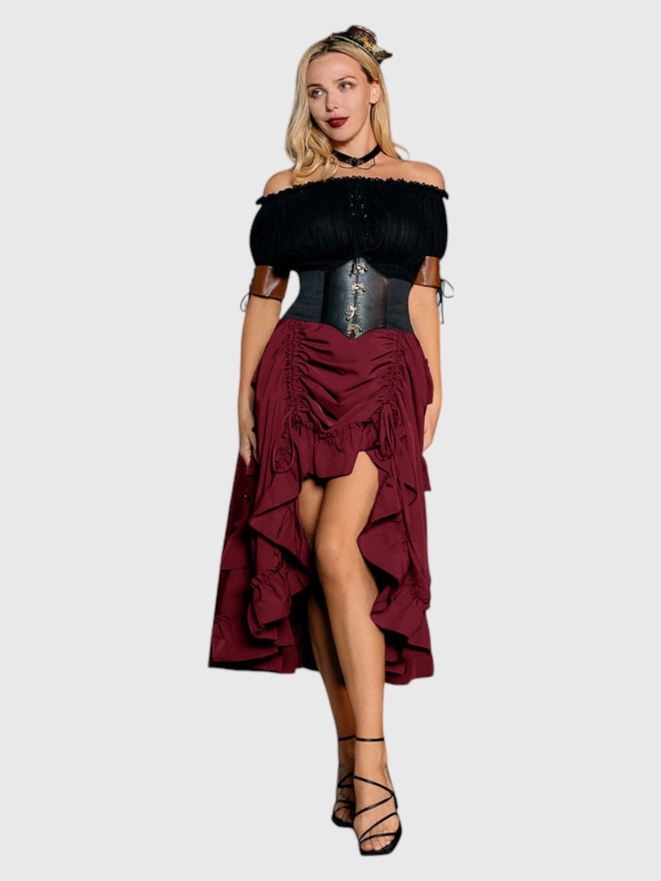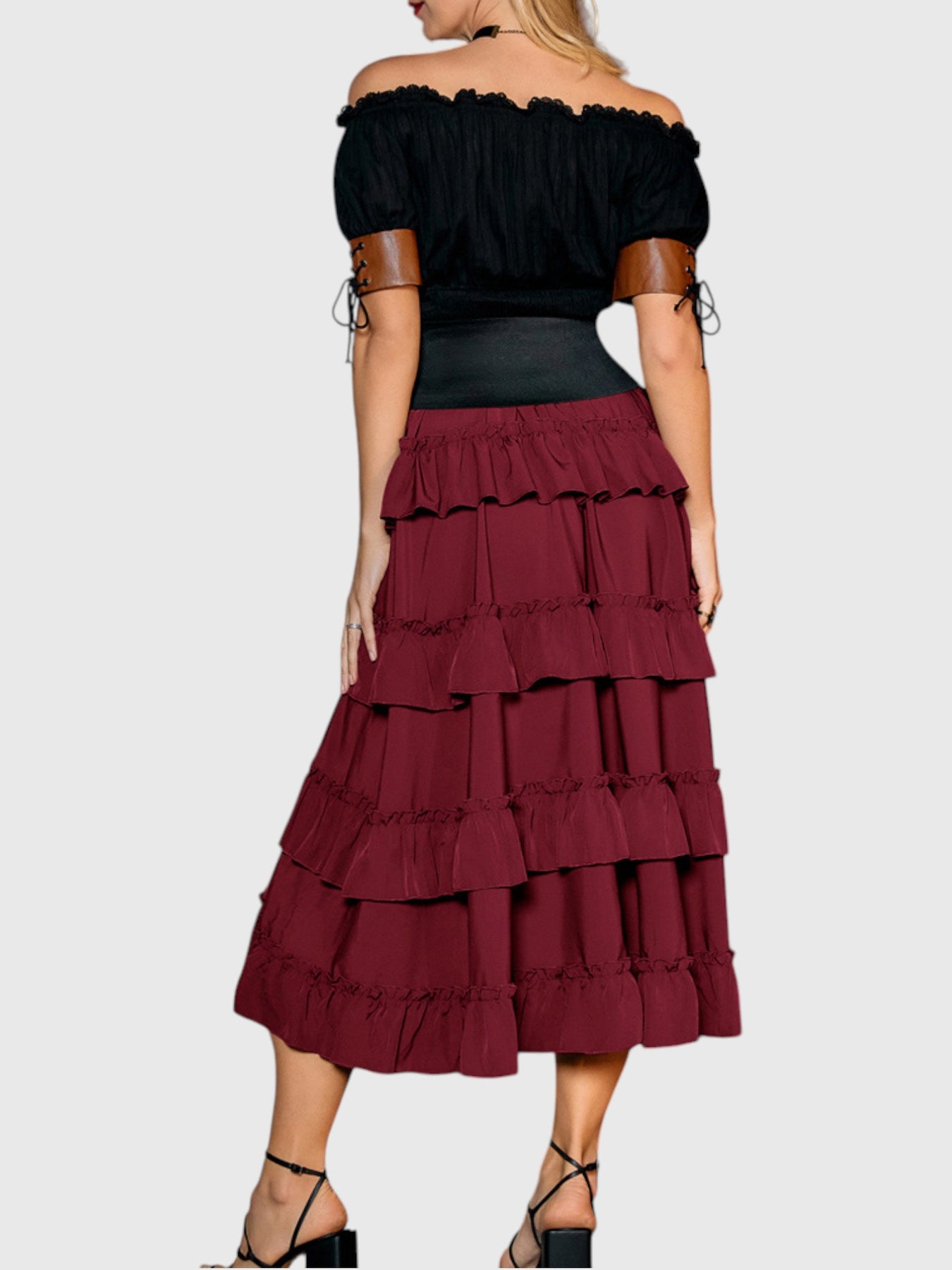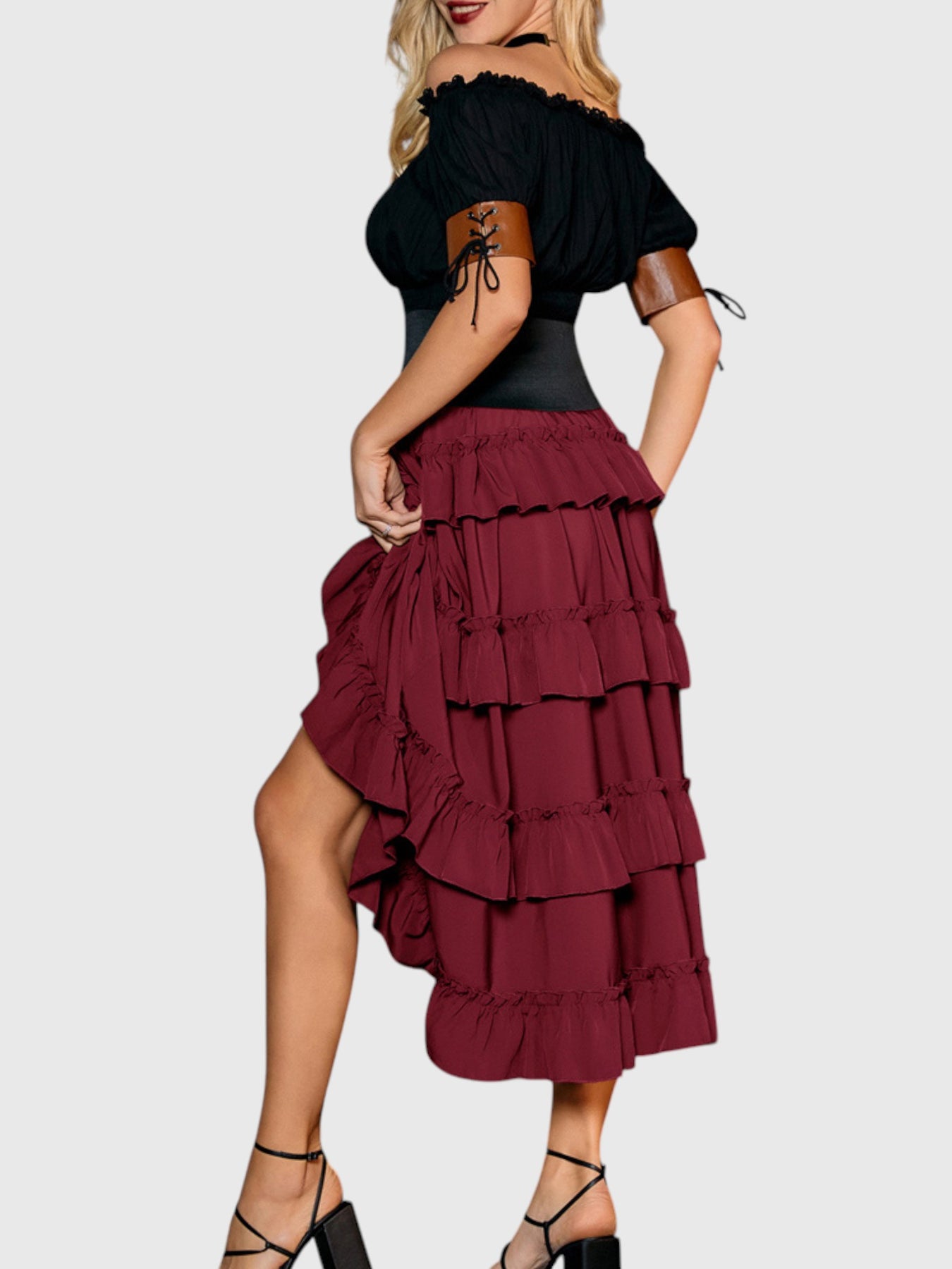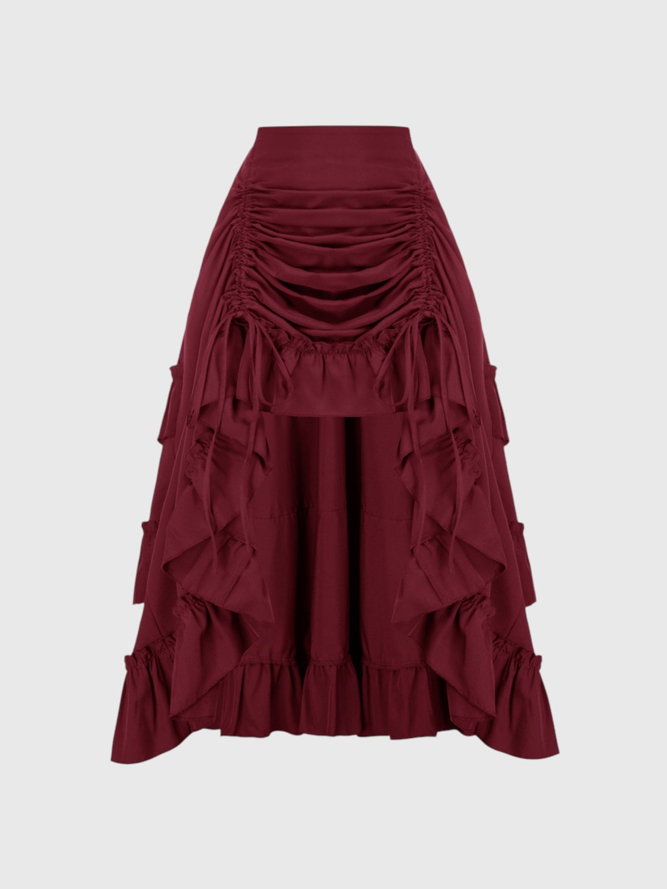 This elegant mid-calf skirt features shirred detailing and cascading ruffles, blending vintage charm with modern comfort. With a natural waistline and a slightly stretchy polyester blend, it’s perfect for casual wear, cosplay, or themed events across all seasons.