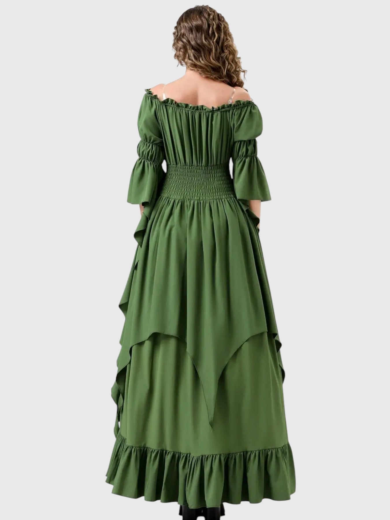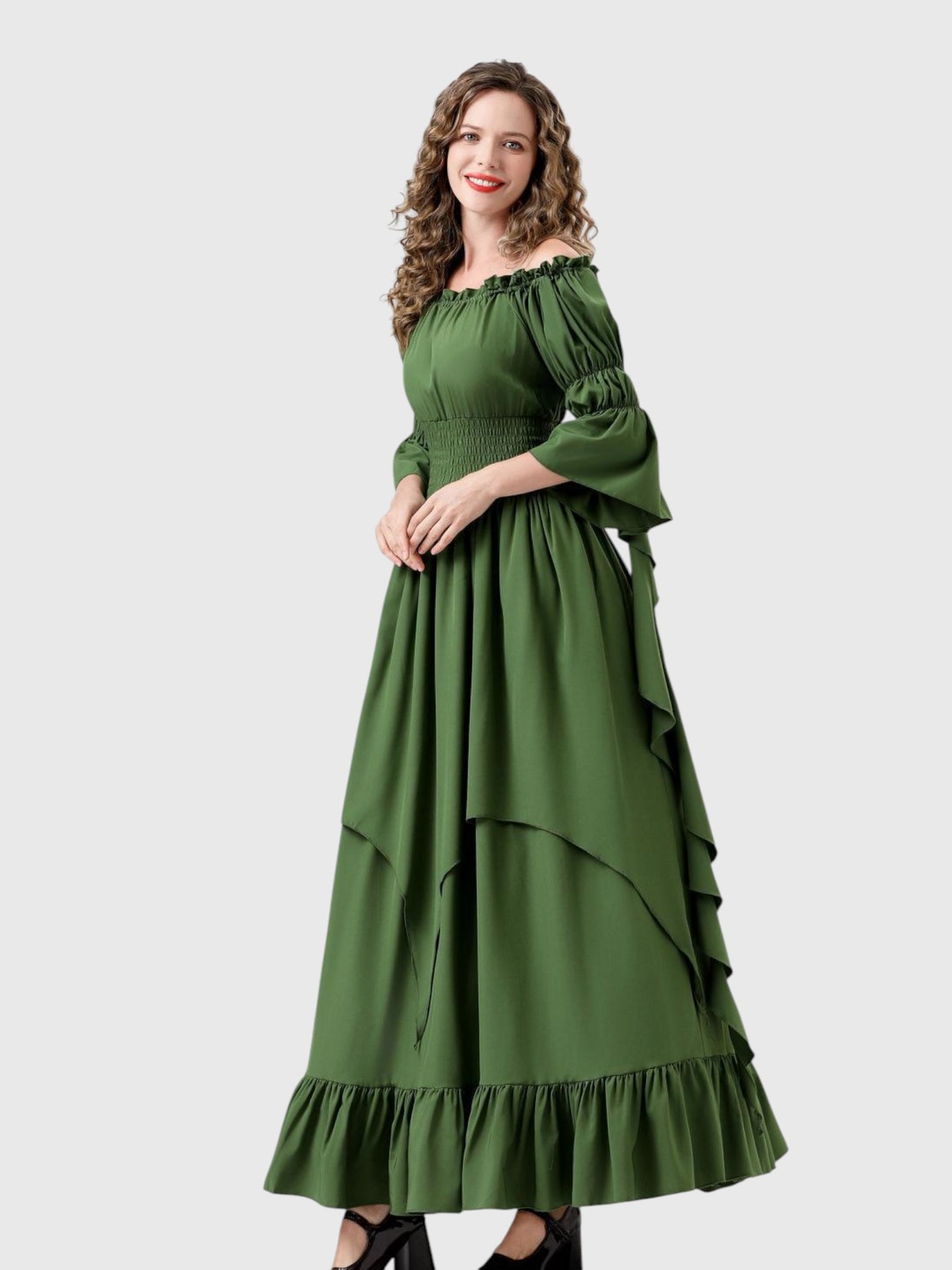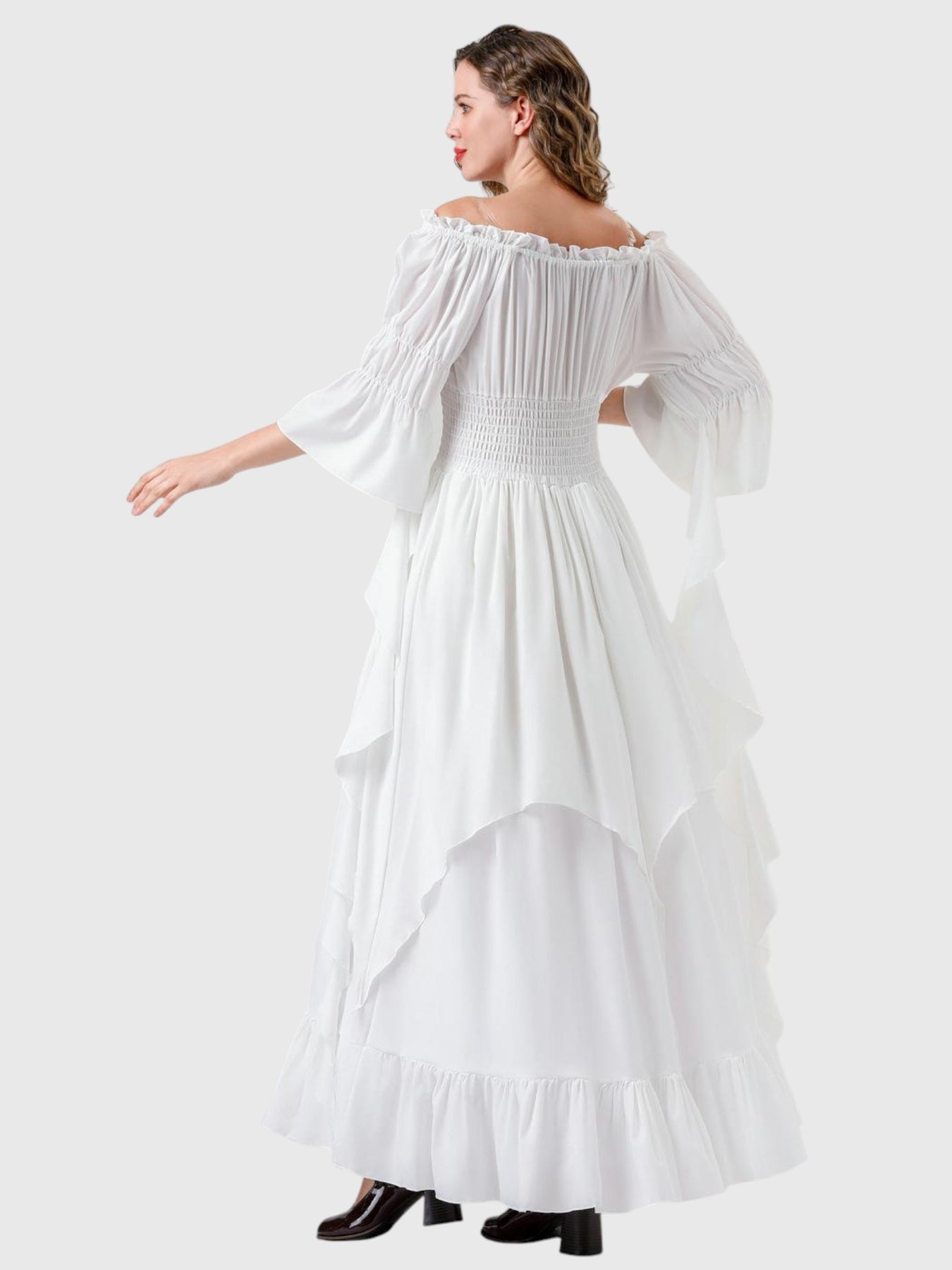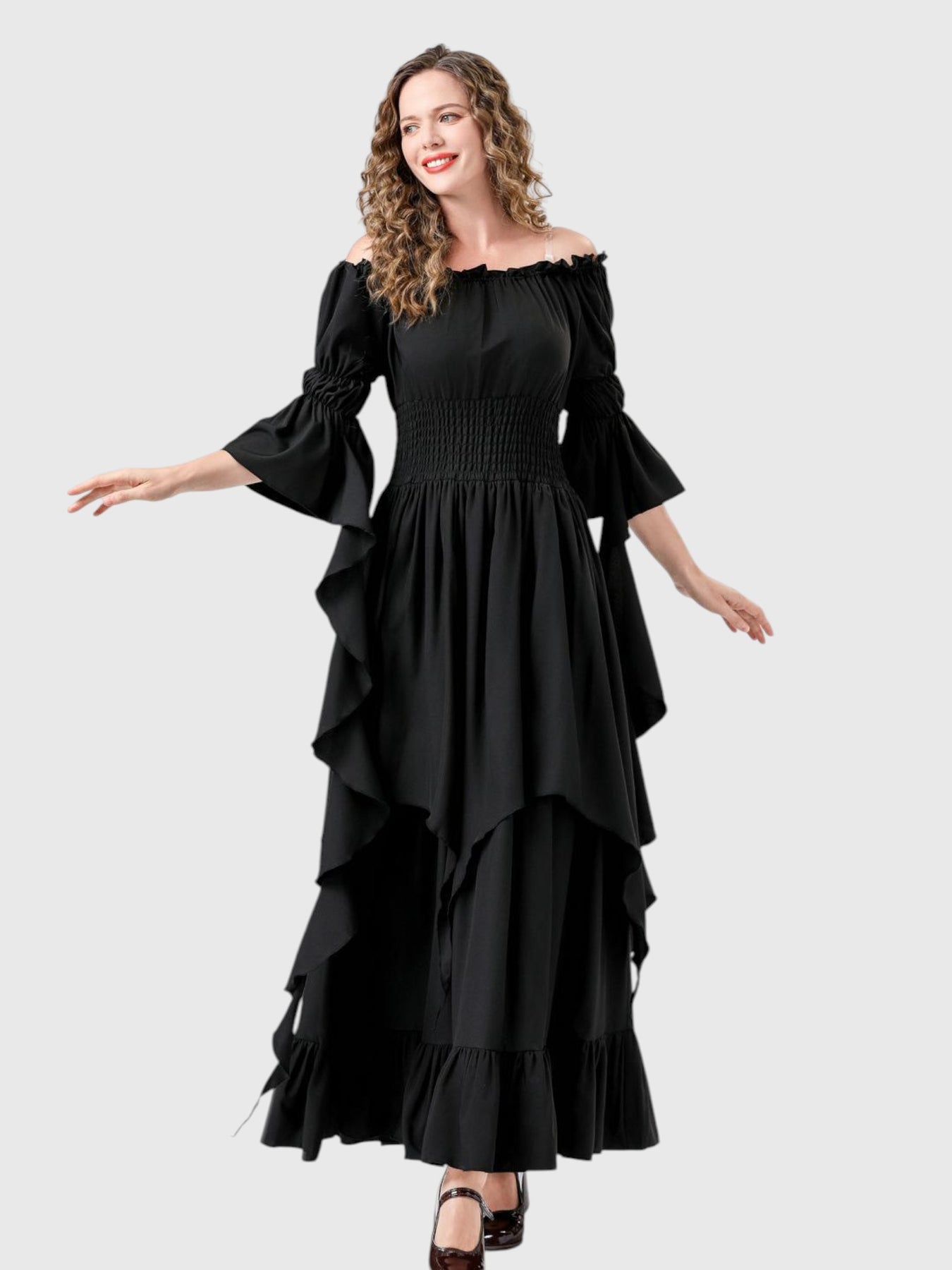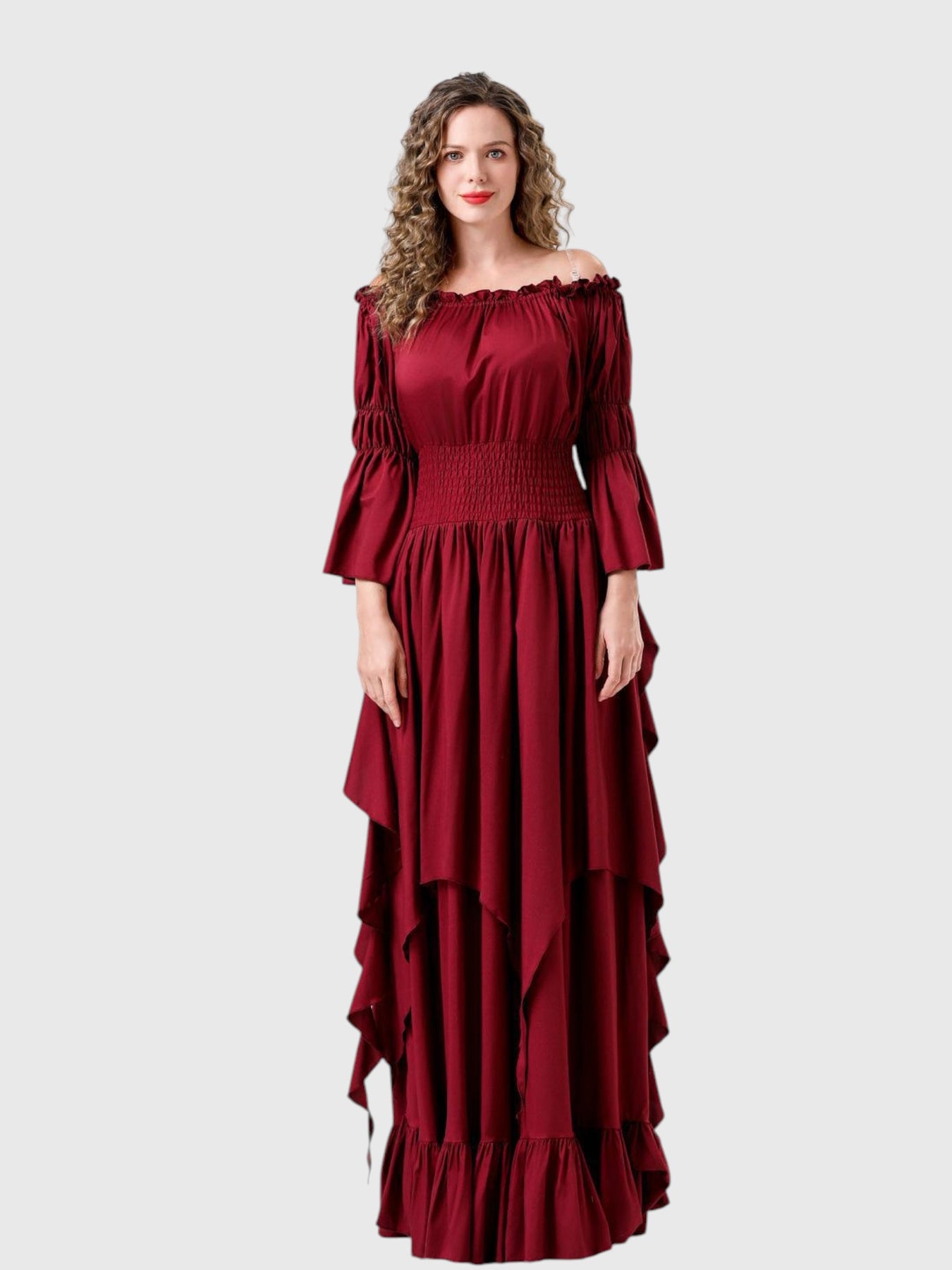 Step into a fairytale with this flowing Renaissance-inspired maxi dress. Gracefully off-shouldered with dramatic bell sleeves and a smocked bodice that flatters your shape, it combines romantic elegance with comfort. Ideal for themed gatherings, festivals, or adding a touch of old-world charm to your evening look.